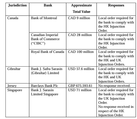 恒大的律师此前称,泽西岛巴克莱银行账户亦有67.5万英镑存款(约合人民币629.8万元),嘉盛莱宝银行新加坡有限公司银行账户存有7100万美元(约合人民币5.03亿元),需要取得当地法院签发的正式命令方可执行;也有银行未就此作出实质回应。